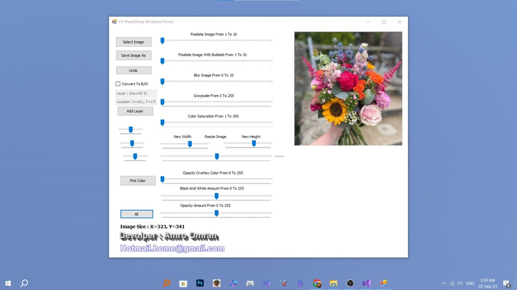 All Image Functions Blur Resize Pixelate Pixelate Image With Bubbels GrayScalc Image Layers Black And White Husaturation Opacity Color Over Image With Opacity Open New Image Save Output Image Undo For Download From Gumroad Just but 0$ then Download or buy me a coffee if you want :)